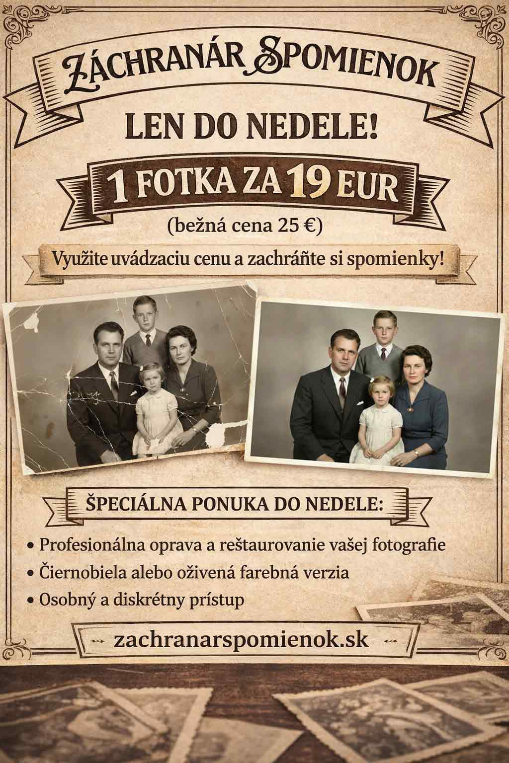 ● alebo ak chcete začať úplne jednoducho s jednou fotkou: Len do nedele 8. 2. vám ju zreštaurujeme za 19 € (bežná cena 25 €).